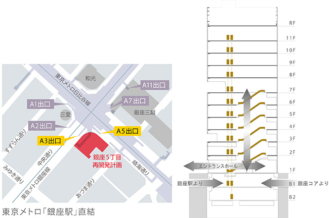 地下1階は東京メトロ銀座駅と直結。1階は、銀座四丁目交差点に面した角地にメインエントランスをつくり、晴海通り側にサブエントランスを配置します。